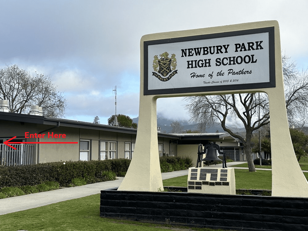 456 N Reino Rd, Newbury Park, CA 91320Enter through the main gate (near the “Home of the Panthers” sign), and walk straight ahead to the indoor cafeteria: